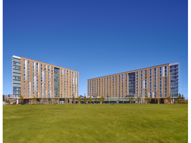 The new University Center Complex towers were seen by the jury as a solid move, especially given the steeply sloped terrain along the Hudson River. Jurors appreciated the inclusion of green roofs, rain gardens, and native plantings, elements that integrate natural systems into the students’ day-to-day lifestyles, provide teaching opportunities, and outwardly express environmental design to the student population. The University Center Complex’s site design and ground-level conditions were also praised and were seen as contributing positively to community impact.