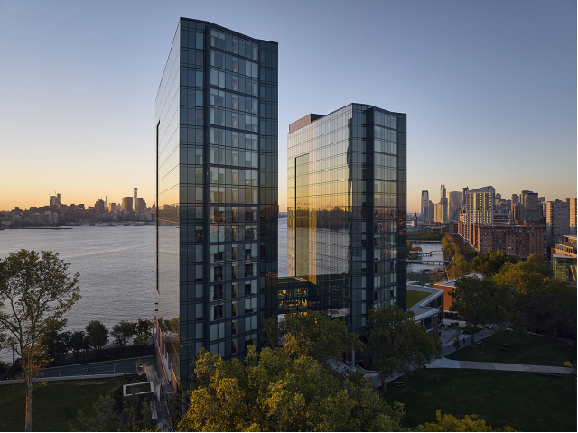 The new University Center Complex towers were seen by the jury as a solid move, especially given the steeply sloped terrain along the Hudson River. Jurors appreciated the inclusion of green roofs, rain gardens, and native plantings, elements that integrate natural systems into the students’ day-to-day lifestyles, provide teaching opportunities, and outwardly express environmental design to the student population. The University Center Complex’s site design and ground-level conditions were also praised and were seen as contributing positively to community impact.