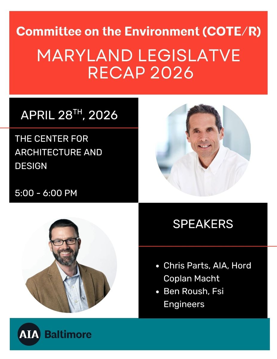 Join AIA Baltimore’s Committee on the Environment (COTE/R) for a recap of the 2026 Maryland legislative session. The presentation will be led by Chris Parts, AIA, Principal at Hord Coplan Macht and AIA Maryland Legislative committee chair. The presentation will center on legislation that impacts the built environment and the practice of architecture including bills that passed, bills that didn’t pass, and what we might see come back for the 2027 legislative session. The program will conclude with a brief discussion with Ben Roush, PE, Principal at FSi Engineers, and AIA Baltimore COTE|R co-chair, on the Maryland Green Building Council. The Council assists the Governor and General Assembly on reviews and recommendations regarding green building legislation and promotes green building throughout Maryland’s government and private sector. Ben will present on updates to the Maryland High Performance Green Building Program taking effect in April for all electric buildings and LEED v5.